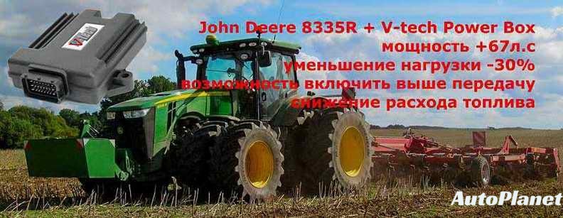 - Отключить сажевый фильтр DPF, клапан EGR- Увеличить мощность двигателя до +20%- Сократить время выполнения полевых работ- Увеличить производительность техники- Отключить систему мочевины AdBlue- Снизить расход топлива Пример:Трактор John Deere 6150M - 6.8л. 150 л.с/ 677 NmТрактор John Deere 6170M - 6.8л. 170 л.с/ 768 NmТрактор John Deere 7270R - 6.8л. 270 л.с/ 1245 NmКомбайн John Deere W550 - 6.8л. 291 л.с/ 1338 NmВсе они используют один и тот же двигатель 6.8л. V6,а мощность каждого обусловлена только программным обеспечением ЭБУ.Даже в самом мощном, можно увеличить мощность оптимально до +20%. Чип тюнинг трактор New Holland комбайнЧип тюнинг трактор Steyr сельхозтехникаЧип тюнинг трактор John Deere комбайнЧип тюнинг трактор Fendt комбайнЧип тюнинг трактор McCormick сельхозтехникаЧип тюнинг трактор Claas комбайнЧип тюнинг трактор JCB сельхозтехника, спецтехникаЧип тюнинг трактор Valtra сельхозтехникаЧип тюнинг трактор Case IH комбайнЧип тюнинг трактор Landini сельхозтехникаЧип тюнинг трактор Deutz Fahr комбайнЧип тюнинг трактор Lamborghini сельхозтехникаЧип тюнинг трактор Massey Ferguson сельхозтехника